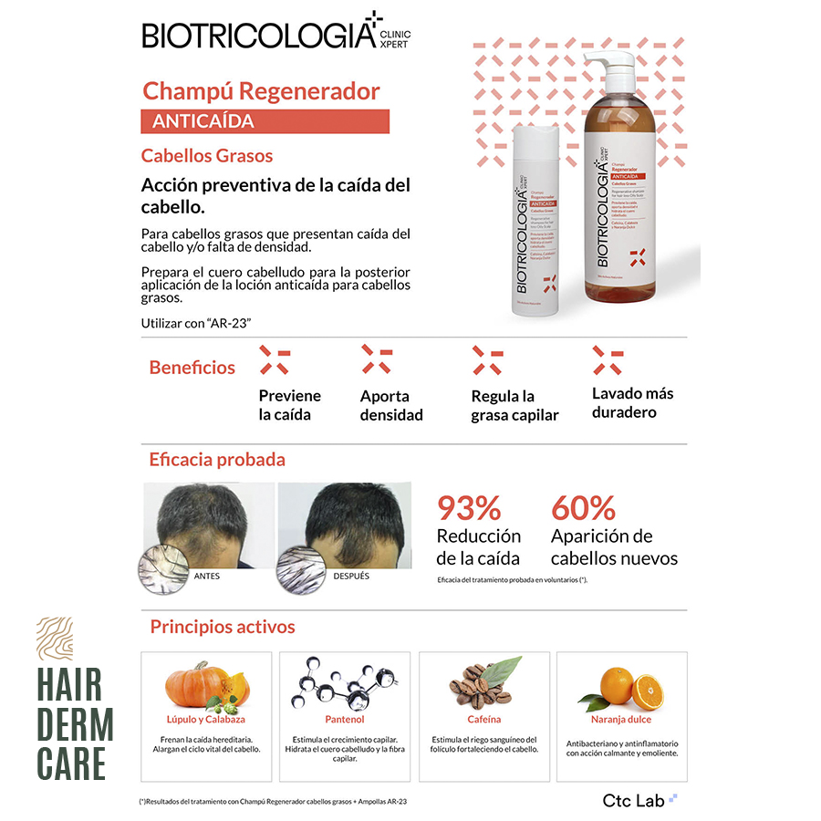 Champú anticaída para pelo graso, formulado suavemente para tratar cueros cabelludos con pérdida de cabello o reducida densidad capilar. Adecuado para ambos sexos, efectivo en áreas calvas y en cabellos frágiles o debilitados. Sin parabenos | Sin siliconas