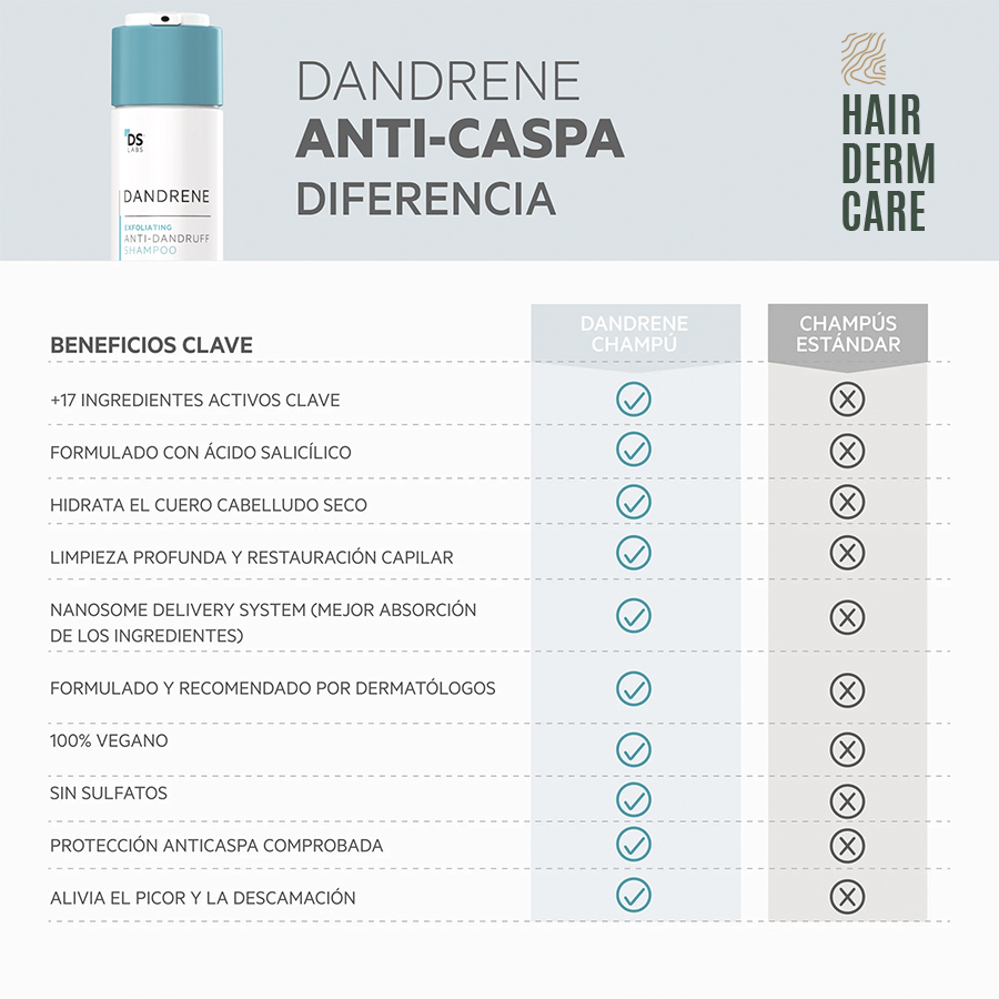 Este producto está específicamente formulado para tratar la caspa de origen no micótico y por seborrea, lo que significa que actúa principalmente sobre desequilibrios en la producción de grasa y la renovación celular. A diferencia de otros tratamientos más agresivos, este champú combina acción exfoliante y reguladora, permitiendo tratar la caspa sin comprometer la salud del cuero cabelludo ni resecar en exceso el cabello.