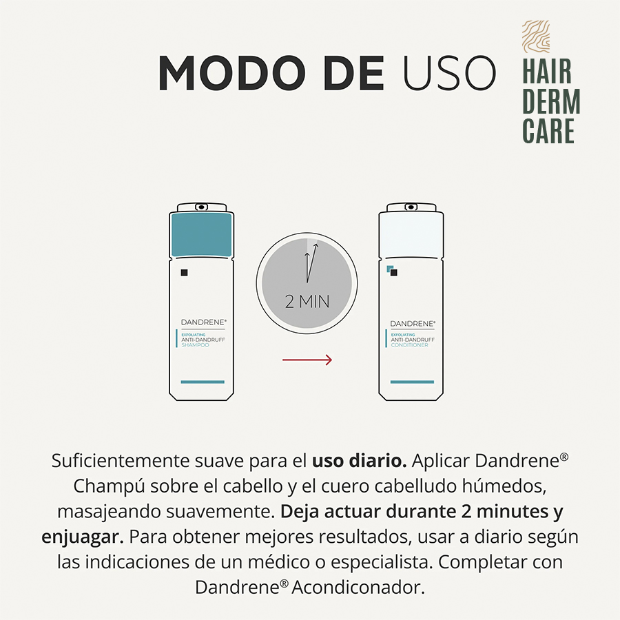 Dejar actuar el producto durante al menos 2 minutos, permitiendo que los activos reguladores y exfoliantes actúen sobre la descamación, el exceso de grasa y el origen de la caspa seborreica. Este tiempo de exposición es fundamental para mejorar el control de la caspa y potenciar el alivio del picor y la irritación.