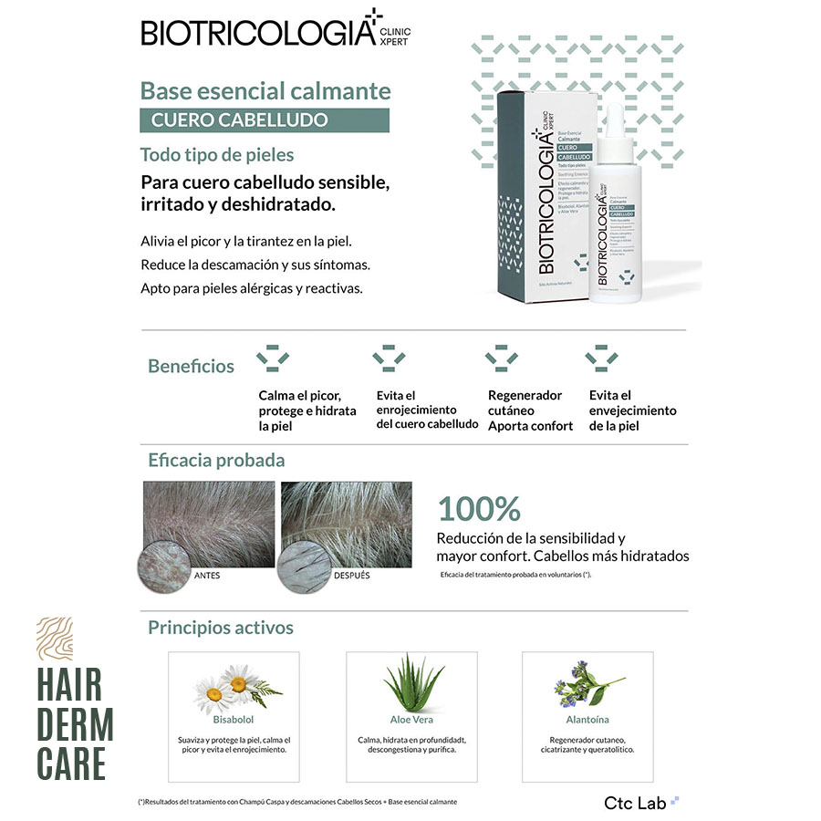 El uso constante de una loción calmante capilar proporciona un alivio continuado, mejorando la tolerancia de la piel ante tratamientos tópicos, cambios de temperatura o productos agresivos. Además, su acción antioxidante previene el envejecimiento prematuro de la piel y favorece un entorno capilar saludable para el crecimiento del cabello.