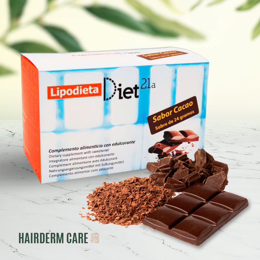 Lipodieta Diet21a Chocolate ofrece una combinación única de proteínas de alta calidad y fibra dietética, diseñada para soportar el adelgazamiento y combatir la flacidez, mejorando el tono muscular y ayudando a reducir la celulitis.